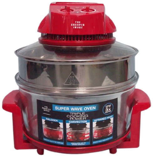 The Sharper Image Red, 1300 -Watt Power / 12-1/2-Quart COOKS UP TO 3X FASTER. The Sharper Image Super Wave Oven. Forget about traditional ovens, stove tops and microwaves. Introducing The Sharper Image Super Wave Oven, a versatile cooker that combines halogen heat, convection and infrared technology keeping foods moist on the inside and browned and crispy on the outside without the use of added fats or oils. Combines Halogen, Convection and Infrared Heat Technology; Cooks From Frozen, No Need To Defrost; Cooks Multiple Foods at the Same Time; Uses Less Energy than Conventional Ovens Halogen directly heats the surface of the food for browning. Gentle infrared heat cooks food inside out, sealing in juices. Convection circulates the hot air, evenly distributing the heat and speeds cooking up 3 times faster. Roast chicken, bake fish, broil steaks, air fry chicken, grill meats, steam vegetables and even make dessert. Bring frozen foods straight from the freezer into the oven without defrosting. Includes 2 stainless steel cooking racks (low and high) so you can prepare a whole meal at once. Taste the difference.
