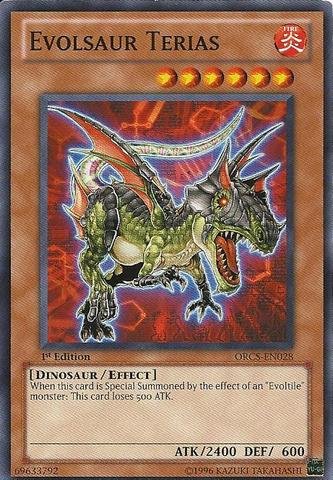 Yu-Gi-Oh - Evolsaur Terias, Yu-Gi-Oh! is a strategic trading card game in two players Duel each other using a variety of Monster, Spell, and Trap Cards to defeat their opponent's monsters and be the first to drop the other's Life Points to 0. Card Name: Evolsaur Terias Card Type: Effect Monster Card Number: ORCS-EN028 Set: Order Of Chaos Attack/Defense: 2400/600 Attribute: Fire Level: 6 Monster Type: dinosaur Passcode: 69633792 Card Text: When this card isSpecial Summonedby the effect of an "Evoltile" monster: This card lo