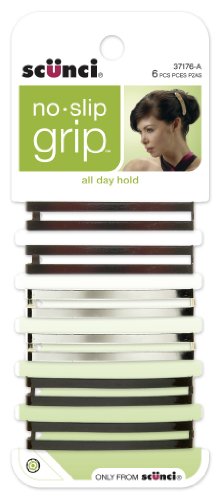 Scunci No-slip Grip, With scunci no-slip grip barrettes at her fingertips a woman should never have a bad hair day. snap one of these open center rectangular barrettes into place and your style stays all day. these easy to apply barrettes feature a rubber sleeve with our no-slip technology, so once you've put them in, they stay in. they hold especially well on fine hair and are ideal for updos or side accents. secure stray strands with aplomb. 6 pack of metal shades for chic accent.